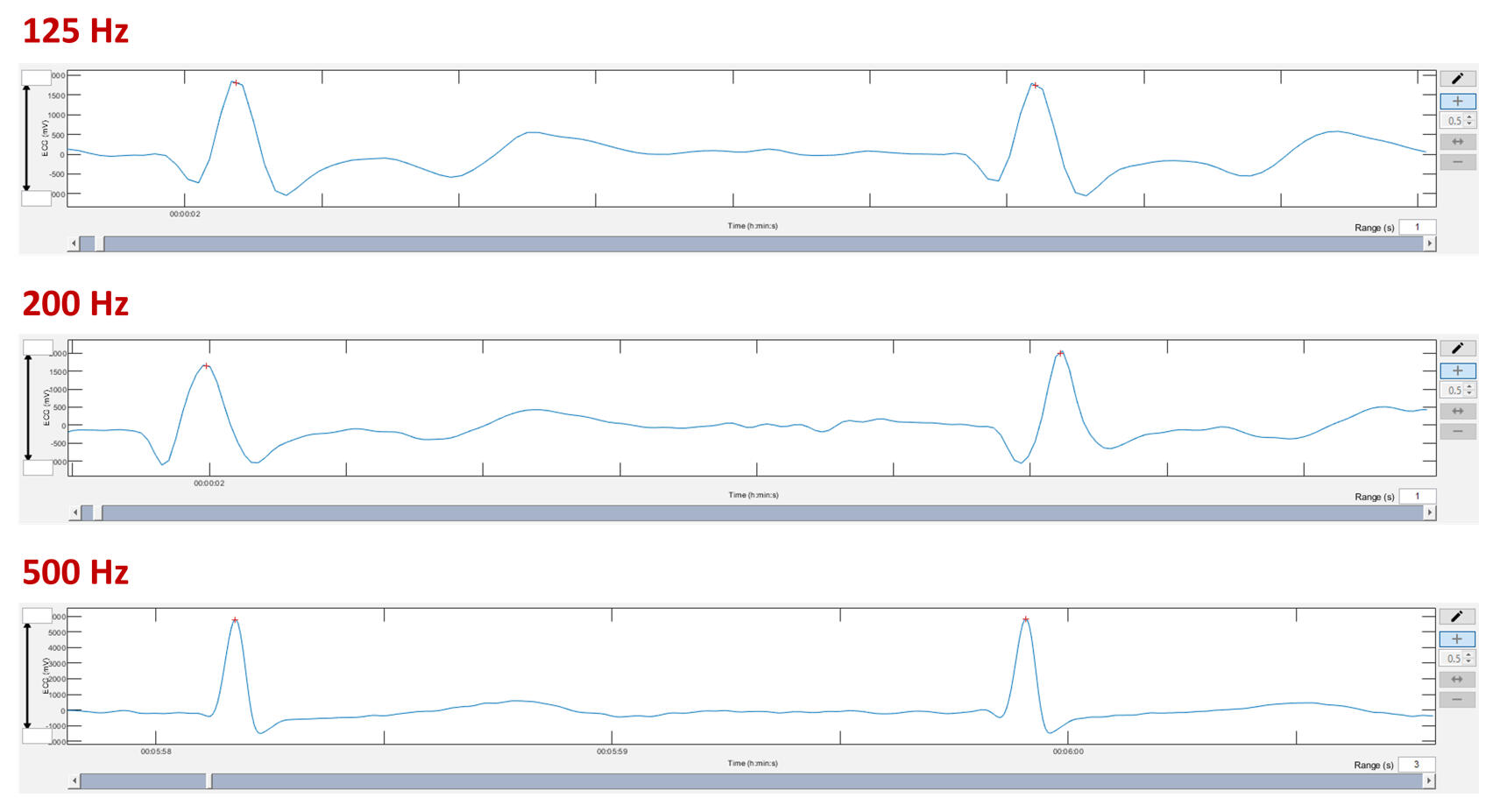 There have been several publications examining the importance of sample rates for HRV and even DFAa1. They do not indicate huge disparities in results comparing rates of 128 and 1000 Hz. But, they have been done at rest and no study has looked at what happens during exercise. The problem with lower sample rates is that the waveform loses some smoothness and definition. Remember, with the lower sample rate, less information about the wave structure is present.Here are a few examples of ECG tracings with different sample rates: