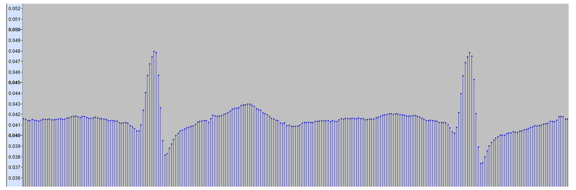 Here is a Hexoskin sample from Bruce Rogers taken from the .wav file using Audacity. This is a great example of a low-ish sample rate (256 Hz). Each data point that makes up the waveform structure is now exposed.