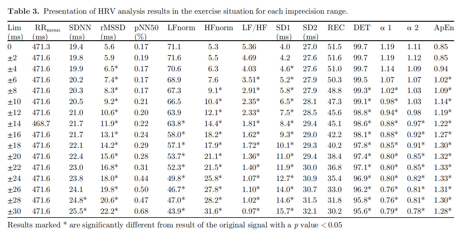 Although the state of research related to DFAa1 and endurance exercise is encouraging, there are still potential limitations for this approach. Both the common occurrence of missed beat artifact and possible RR recording device bias could lead to erroneous DFAa1 values. Previous studies looking at missed beat artifact correction bias indicated variable effects on DFAa1 and none examined how HRV based exercise thresholds could be changed with increasing artifact presence. In addition, the popular software Kubios HRV has two distinct varieties of artifact correction methodology (automatic and threshold artifact correction), whose potential influence with respect to DFAa1 calculation or physiological thrshold determination should be evaluated. To better understand these issues, we examined the effect of introducing progressive amounts of dropped signal artifact (by randomly deleting QRS complexes) to induce levels of 1, 3 and 6% artifact in otherwise ideal ECG tracings. Both Kubios HRV automatic and medium threshold artifact correction methods were evaluated for bias. A negligible amount of bias was produced by 1 and 3% artifact correction with both methods. A larger amount of proportional bias (positive bias at low DFAa1, negative bias at high DFAa1) was seen with the threshold correction method at the 6% artifact level, rising to a maximum of 19% bias at very low, anticorrelated values of DFAa1. Fortunately, despite the varying degrees of bias seen, the heart rate at HRVT level did not differ between control (no artifacts) and any of the artifact groups or correction methods by more than 1 bpm. This is certainly reassuring regarding practical usage of HRV based exercise threshold determination and other fields of application.Another aspect of the mentioned study about artefact correction addressed whether the HRVT calculated from ECG was equivalent to the HRVT obtained by a chest belt (Polar H7) worn simultaneously only recording RR intervals. There was a small degree of bias at HRVT seen with the Polar H7, 4 bpm lower than that of the ECG. Several possibilities exist as to why there may be differences between devices. DFAa1 is a measure of RR related fractal correlation properties and therefore, specific patterns in the heart rate time series. Hence, a loss of RR resolution may lead to a failure to discern these patterns, leading to mistaken measures of fractal correlation properties. In support of this, a reduction in R peak detection precision has been shown to affect DFAa1 determination. According to Polar documentation, the R peak detection precision was enhanced in a next generation device, the Polar H10, implying that there was room for improvement in this property.Here is an example of a premature beat (APC) recorded with a single channel ECG tracing (Movesense Medical chest belt module) and processed via Kubios HRV Premium software; this results in a short and longer RR interval:
