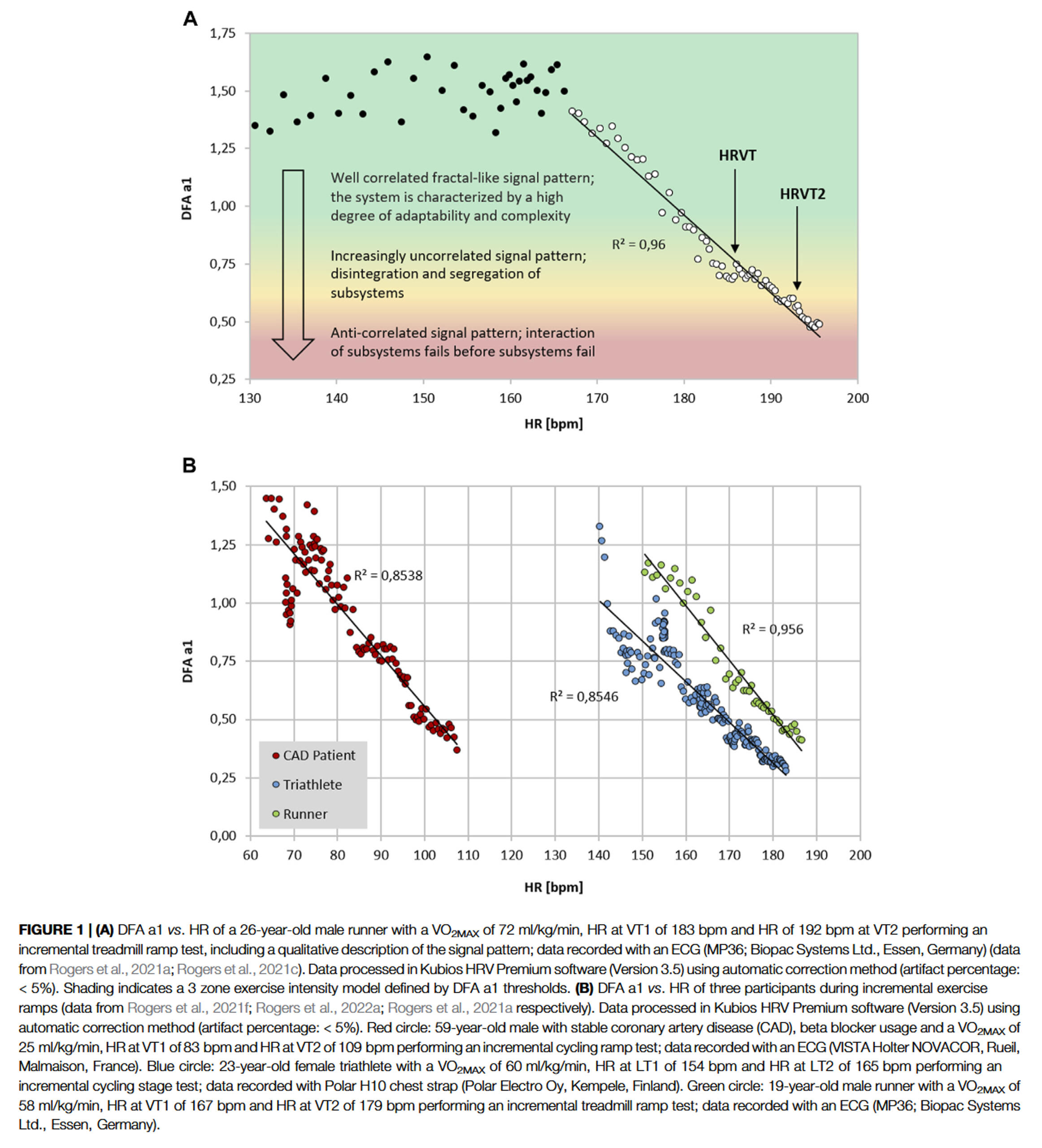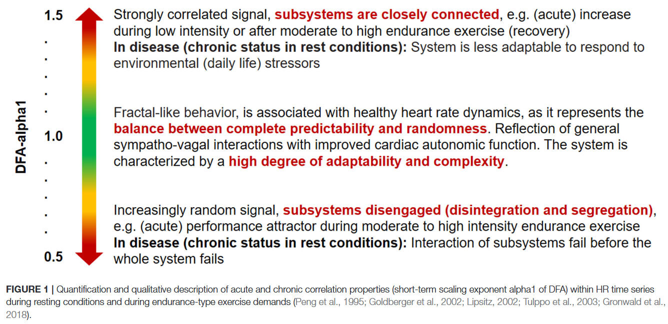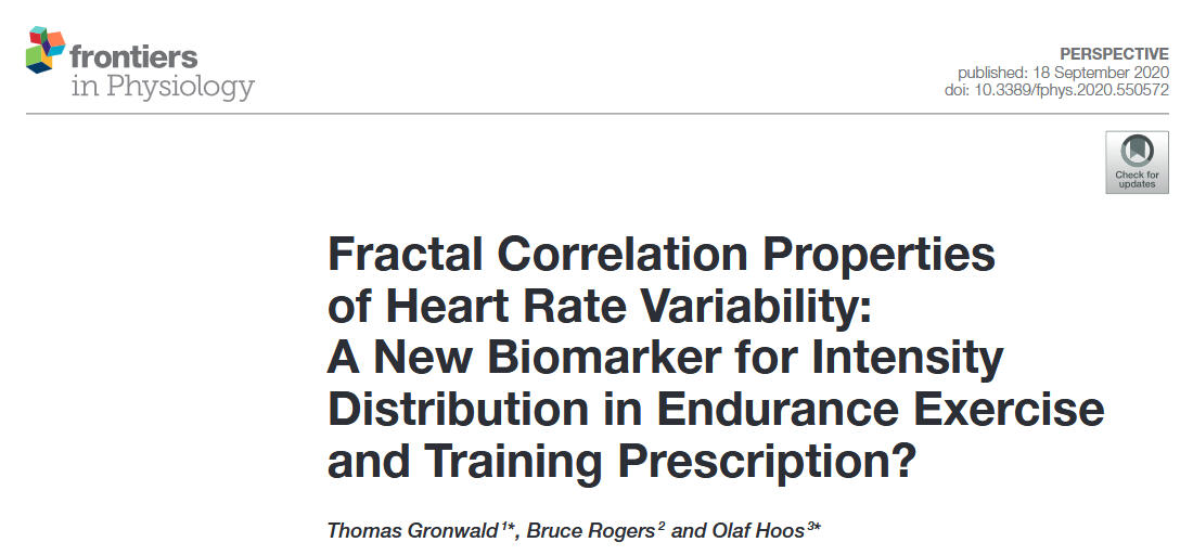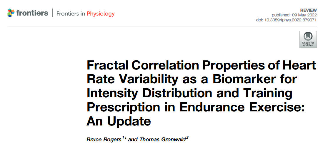 Rogers, B., & Gronwald, T. (2022). Fractal Correlation Properties of Heart Rate Variability as a Biomarker for Intensity Distribution and Training Prescription in Endurance Exercise: An Update. Frontiers in Physiology, 13, 879071. https://doi.org/10.3389/fphys.2022.879071