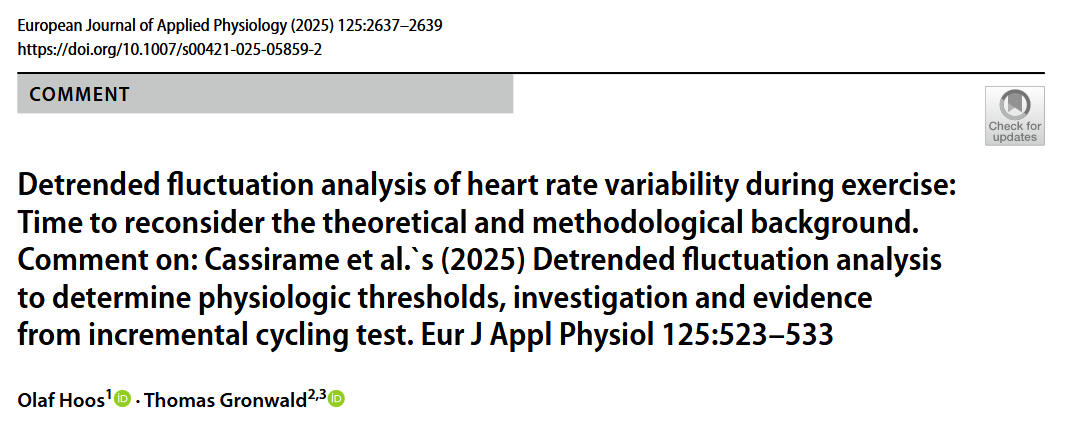 Hoos, O., & Gronwald, T. (2025). Detrended fluctuation analysis of heart rate variability during exercise: Time to reconsider the theoretical and methodological background. Comment on: Cassirame et al.`s (2025) Detrended fluctuation analysis to determine physiologic thresholds, investigation and evidence from incremental cycling test. European Journal of Applied Physiology, 125, 523–533. https://doi.org/10.1007/s00421-025-05859-2
