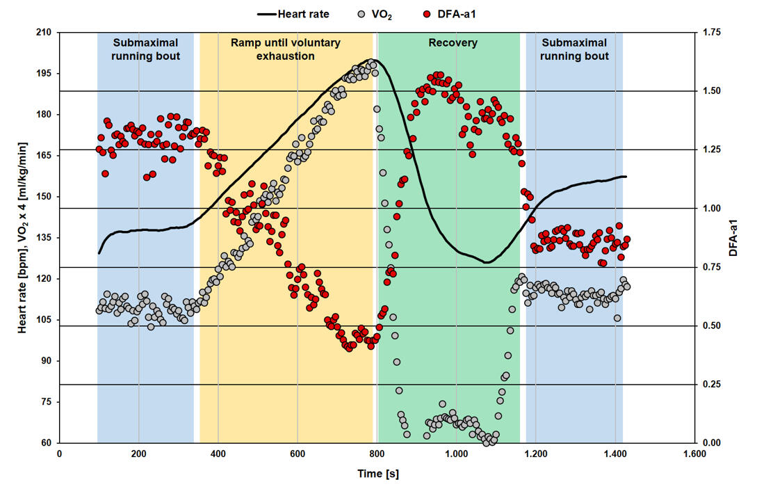 Multiple measures of endurance exercise induced fatigue have been explored, none are of practical value while in the midst of an exercise session or race. There are also questions regarding the validity of heart rate drift as a sign of fatigue during exercise. Heart rate drift appears to be a complex phenomenon that can normalize or even reverse with very long endurance efforts. Established performance indices or biomarkers such as counter movement jump height, running economy, muscle enzyme elevation like creatine phosphokinase, salivary hormones, markers of substrate availability, blood lactate concentration and cortical activity are mainly used after the activity, during interval sessions or as monitoring tools at periodic times during standardized rest conditions. While regular HRV monitoring at rest has been proposed as a means to prevent functional overreaching and assess baseline autonomic balance, no HRV index has been shown to have the ability to demonstrate fatigue while performing exercise. Since DFAa1 possesses dynamic range through all exercise intensity zones, a divergence between an indicator of autonomic status and measures of external load (e.g., power/pace) could potentially be used as an indication of fatigue while still performing the activity. For instance, if DFAa1 is usually 0.75 at a pace representing the aerobic threshold in a well-rested individual, would it be different after lengthy endurance exercise? To this date, there are already multiple studies that show the observation of inappropriately suppressed DFAa1 values at an exercise intensity previously shown to be associated with well correlated values, which can be potentially viewed as an autonomic indicator of fatigue. For example, following an ultramarathon, DFAa1 exhibited suppressed behaviour during constant low-intensity exercise, also associated with reduced countermovement jump scores indicating neuromuscular fatigue. Further, in a pilot study it could be determined that the relationship between DFAa1 and power output during low-intensity warm-up may serve as an indicator of autonomic status and residual fatigue in triathletes, thereby DFAa1 being valuable to inform daily training adjustments. While this research provided insights into the usefulness of DFAa1 and fatigue assessments, the study involved only 11 athletes and a follow-up of 36 hours. Interestingly, this is the only study which investigated the effect of exercise on DFAa1 not directly after exercise cessation, but in the following day(s) as heart rate time series structure needs to reorganize and return to pre-exercise values. You can find an overview in the subsequent bibliography of this blog post.Display of DFAa1 during low-intensity submaximal running bouts prior and after an exhausting ramp until voluntary exhaustion: