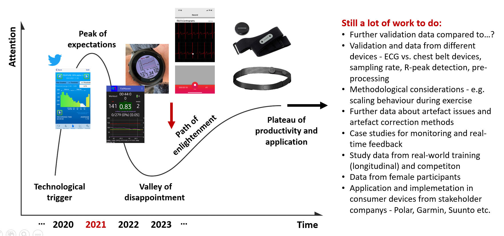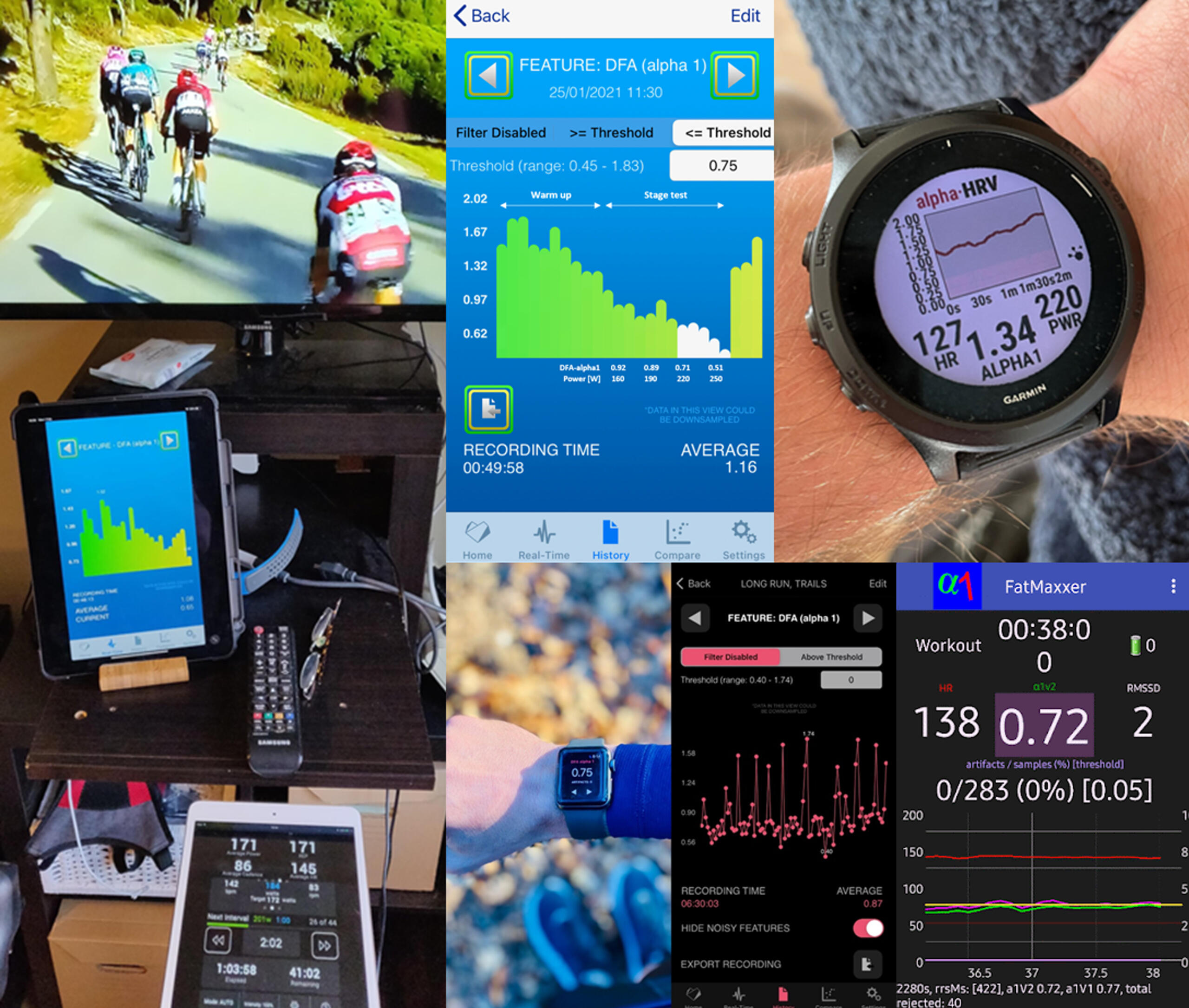 While DFAa1 is an appealing physiologic biomarker, important factors such as accurate, low cost calculation and simplified data display are needed for widespread consumer usage. Over the last years, several web and smartphone applications have been developed to display DFAa1 independently of analysis software such as Kubios HRV. Websites such as “Runalyze.com” and “AIEndurance.com” utilize similar preprocessing (smoothness priors detrending), artifact correction (threshold approach) and time varying DFAa1 calculation methodology as Kubios HRV Premium (now „Scientific“) for retrospective session analysis of DFAa1. Standard Garmin.fit files can be uploaded for analysis with estimation of HRVT based on linear regression using time varying computation of power/heart rate and DFAa1. The AIEndurance platform also tracks previous warm-up session DFAa1 to power relationships to estimate “readiness to train” as well as overall session deterioration in DFAa1 per unit power for estmates of “durability”. Also of note is the availability of low cost smartphone apps that can process heart rate monitor data in real-time, providing a live view of DFAa1 status during exercise activities. A previous report described the use of the smartphone app “HRV Logger” (Android and iOS available) in both threshold determination and implementation of a polarized session program in a former Olympic triathlete. This particular application displays DFAa1 every 2 min sequentially without rolling window recomputation and slighlty other preprocessing settings of the raw signal. A newer app called “Fatmaxxer” (Android available, https://github.com/IanPeake/FatMaxxer) enhances DFAa1 measurement capabilities even further. It includes features present in Kubios HRV such as similar preprocessing (smoothness prior detrending), threshold correction and recalculation of DFAa1 e.g., every 5 s using 2-min rolling windows (time varying analysis: window width of 2 min, grid interval of 5 s). For both applications a Polar H10 for recording RR intervals is recommended. Lastly, “alphaHRV” a DFAa1 data field for Garmin devices (watches and cycling head units; without a smartphone being needed) is available in beta testing (https://apps.garmin.cn/apps/1a69b10a-1d31-4afe-a32f-6a579ae20d9f). It reports DFAa1 along with artifact percentage every second in real-time based on the prior 200 beats, bringing this metric to potentially millions of Garmin units. Although it is using an alternate method of preprocessing and a measurement window of 200 beats (instead of 2 min), the data is close to that of the Kubios HRV software and updates each second (user defined). Artifact percentage is displayed and there is a 2 min running graphical display of DFAa1 on the selected device. Garmin.fit files will contain this data so you can extract for further analysis. „Garmin Connect“ treats this like any data field. Having the ability to display accurate DFAa1 in real-time during an exercise session opens up a myriad of potential options, from on the spot threshold determination to assessment of fatigue status at the start (for daily directed training) as well as during prolonged exercise sessions (durability assessment and/or training interventions).By clicking on the picture below you can see our first applications of real-time usage of DFAa1 with the HRV Logger app published on the blog post page of the British Journal of Sports Medicine: