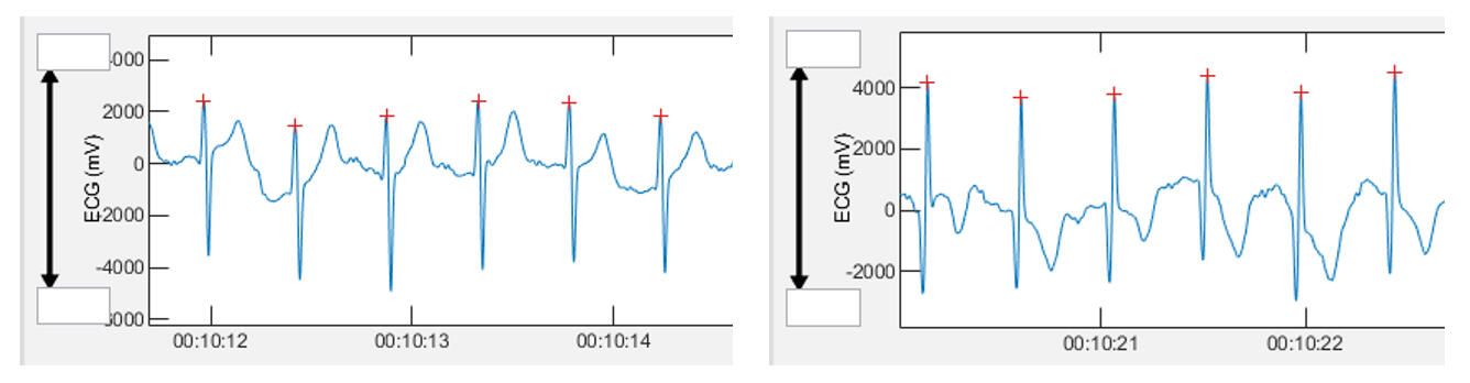 We can see that the voltages and "sharpness" of the R peak are all very different. Although lead 2 did have a better R peak than most, there was tremendous variability in signal voltage (especially lead 3 which is in a location very "near" lead 2). This was reflected in the differences between an averaged value (based on all leads) and each individual lead. Although they conjectured about the respiratory change, it is well known that cardiac axis will shift with respiration. Cardiac axis as noted above, is the net electrical direction of heart muscle electrical activity. Cardiac axis (and therefore waveform) will change during breathing and position. Therefore, ECG waveform distortion is potentially caused by actual cardiac axis shift when the measurement belt is in that particular location.It has been shown that RR intervals and HRV can be different depending on the various leads in a resting ECG. This may be due to alteration in waveform shape, voltage (signal strength) and cardiac axis shifts. These difference may be magnified during position change and especially respiration due to shifts in cardiac axis. For the majority of users, a center belt position is probably fine. However, if one is seeing a lower DFAa1 on a regular basis than should be the case, a slight rotation of the belt to the left may be something to try. This rotation could provide a more symmetrical waveform also increasing signal strength. Rotation of the belt to the right is not recommended.A participant in one of our studies was wearing both an Polar H10 and Movesense Medical sensor (with the potential to record a single lead ECG tracing) during a session, cycling near a first physiological threshold. We were analyzing the time series and noted that DFAa1 appeared way too low for the intensity performed. A look at the ECG waveform from the Movesense Medical sensor data revealed that the bulk of the signal voltage was negative (left picture below)! One would think that Kubios HRV software would auto invert this waveform (especially since that was chosen in the preferences) but it does not. After reimporting the data with "reversed polarity", R peak detection and waveform was enhanced (right picture below). This impacted also the calculation of related DFAa1 values.