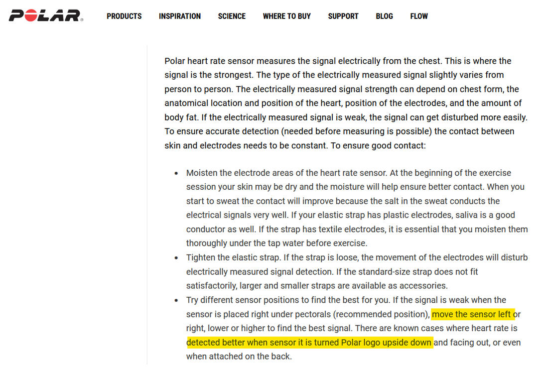 Use cream or electrode gel on the belt sensor pads. Try module centered with Polar logo right side up (default position). Analyze the wave - if it looks good (R peak sharp with minimal negative waveform) you are probably good to go. If the negative part of the wave is greater than the positive - try just inverting the module upside down. Repeat analysis (after inversion). Optional - move the module 2 to 3 cm at a time to the left, potentially as far as the nipple and measure the waveform at each site. Compare all measurements and find the best choice for you. Although we don’t know how common this type of issue is, it probably occurs more often than we think. Going forward with DFAa1 monitoring, we recommend an initial signal optimization protocol to help produce the most precise DFAa1 values. Besides the issue of proper software detrending (as e.g., Runalyze, Fatmaxxer and AI Endurance are doing), signal optimization may help you reproduce published findings.Polar has several information regarding sensor placement and usage on their website (click on the picture below), but has now deleted the information about sensor placement adjustments and about potentially inverting the module on the chest belt to enhance signal strength.