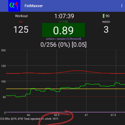 The developer of Fatmaxxer Ian Peake has graciously added a feature to help us decide on optimum signal strength without the need to graph out the ECG. The peak R voltage is now displayed (see below in red circle) beat to beat. This is accurate as long as noise is not present. My recommendation would be to try various belt positions at rest, wait several seconds for the signal to stabilize, then note the voltage. If you are seeing artifacts detected, that could be a sign of more noise or signal distortion (so wait for no artifacts). Find the best voltage and then monitor it as you exercise. It should not change very much. Try to aim for above 1000 µV. If you are seeing <500 µV, chances are that the HRV and even heart rate may not be captured properly. If you are interested, a visual approach is still the best in our opinion, but this gives us a quick, accurate option.Having ECG output is indispensable. It's important to both optimize signal strength, waveform shape and perhaps most importantly, differentiate noise artifact vs. arrhythmia. If you do see aberrant beats, consider manual beat deletion if the DFAa1 curve is atypical. Therefore, inspection of the ECG signal is essential in order to better understand and reduce artifacts. If only RR intervals can be detected, it is recommended to inspect time-varying DFAa1 data in order to explain implausible values with the help of RR intervals and artifact correction and, if necessary, to exclude them.
