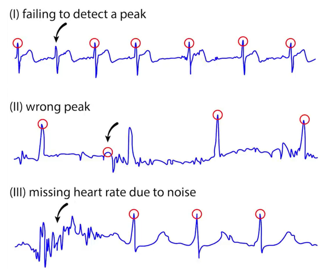 Further, three categories of RR interval detection errors based on comparison between RR intervals provided by software (red circles) and visual investigation of ECG signals from Rahel Gilgen-Ammann (2019, click on the picture):