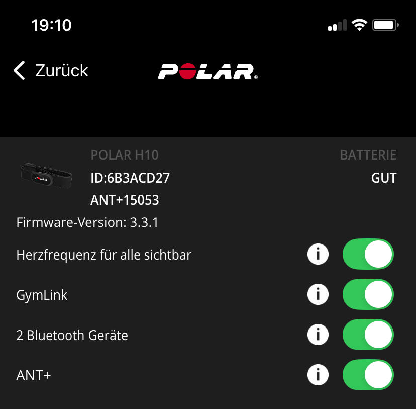 Once enabled you can have your Garmin watch and the appropriate app (or other bluetooth device) receive data at the same time. This applies to ANT+ as well. Using the „Polar Beat“ app, you can turn off multi device bluetooth and/or ANT+ at will. Note: on Polar H10 battery change (or pull) these settings will be lost! You will need to reapply with the app.