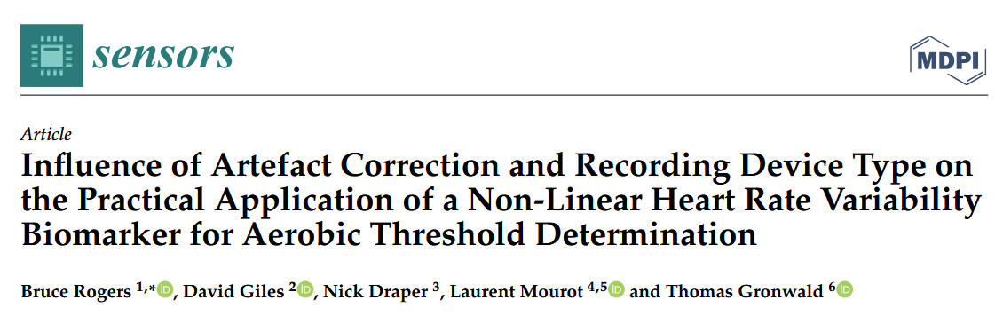 Rogers, B., Giles, D., Draper, N., Hoos, O., & Gronwald, T. (2020). A New Detection Method Defining the Aerobic Threshold for Endurance Exercise and Training Prescription Based on Fractal Correlation Properties of Heart Rate Variability. Frontiers in Physiology, 11, 596567. https://doi.org/10.3389/fphys.2020.596567