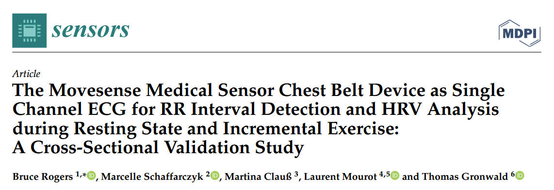 Rogers, B., Schaffarczyk, M., Clauß, M., Mourot, L., & Gronwald, T. (2022). The Movesense Medical Sensor Chest Belt Device as Single Channel ECG for RR Interval Detection and HRV Analysis during Resting State and Incremental Exercise: A Cross-Sectional Validation Study. Sensors, 22(5), 2032. https://doi.org/10.3390/s22052032