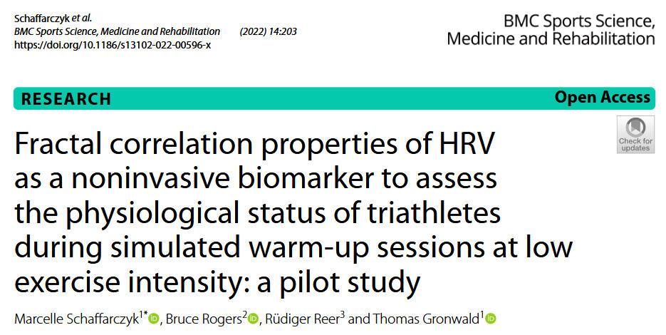 Schaffarczyk, M., Rogers, B., Reer, R., & Gronwald, T. (2022). Fractal correlation properties of HRV as a noninvasive biomarker to assess the physiological status of triathletes during simulated warm-up sessions at low exercise intensity: A pilot study. BMC Sports Science, Medicine and Rehabilitation, 14(1). https://doi.org/10.1186/s13102-022-00596-x